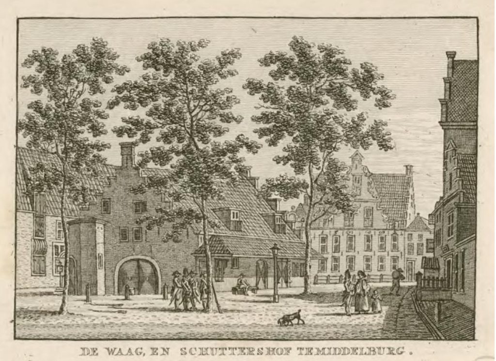 De Waag en schuttershof te Middelburg. Kopergravure naar een tekening van Jan Bulthuis, ca. 1790-1792 – Zeeuws Archief, collectie KZGW ZI-II-0433