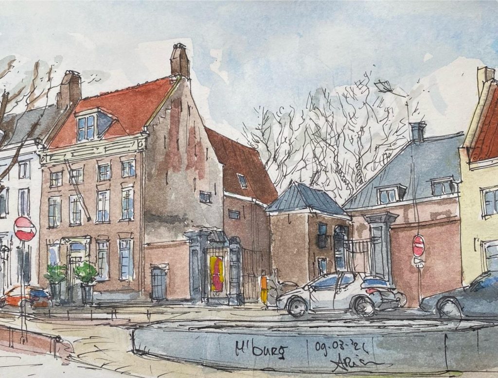 Stadstekenaar 2024 Arian van Dijk zat afgelopen 9 maart met zijn tekenstift en papier op de hoek waar de St. Pieterstraat op de Balans uitkomt. Een originele hoek om het pleintje vast te leggen. Meestal staat de gevel van de St. Jorisdoelen centraal of de Abdijpoort, die beide op de tekening ontbreken. Eigenlijk is de zijde die we zien de meest originele. De Abdijpoort is wel oud, maar de depotruimten (de zo goed als blinde muren) links ervan van voorheen het Rijksarchief en nu het Zeeuws Museum zijn dat niet. Daar stonden voor de brand van 1940 huizen, die overigens in die vorm daar toen ook nog niet zo lang stonden. Ze waren het product van de grote Abdijrestauratie uit het eind van de 19de eeuw. Het pand St. Jorisdoelen draagt wel trots 1582 als bouwjaar, maar is in 1970 als een feniks uit de as herrezen. In de jaren ’60 was hier een keurig onderhouden grasveldje.