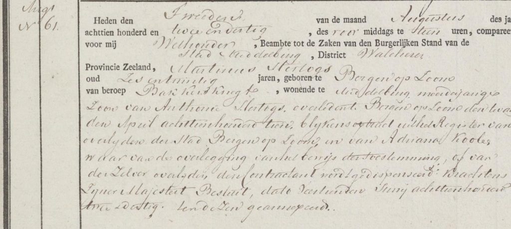 Bij zijn huwelijk in Goes in april 1797 met Anna Sijbel (1775-1811) was Engel Sloover (1776-1853) een timmermansknecht; bij de volkstelling in november van hetzelfde jaar slachter. Daarmee trad hij in het voetspoor van zijn voorgeslacht en ook in de generaties na hem zouden slagers zijn. Slager Sloover aan de Opril in Goes sloot zijn zaak eind 1970. Timmerlieden en schilders waren er ook. Zoon Hendrik (1800-1832) kwam in Middelburg terecht als timmerknecht en kreeg in 1821 de aanmoedigingsprijs in de 2e klas bouwkunde van de Teeken Akademie. Hendrik werd in 1828 bij zijn regiment in Goes verwacht, doch meldde zich niet. In 1830 is hij dan toch onder de wapenen en ingedeeld bij de Zeeuwse mobiele schutterij, waaruit hij om gezondheidsredenen (bloedspuwing) al snel ontslagen werd. Terug in Middelburg volgde in augustus 1832 een opname in het Gasthuis (‘het water’) en in september kwam hij te overlijden.