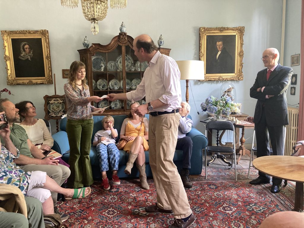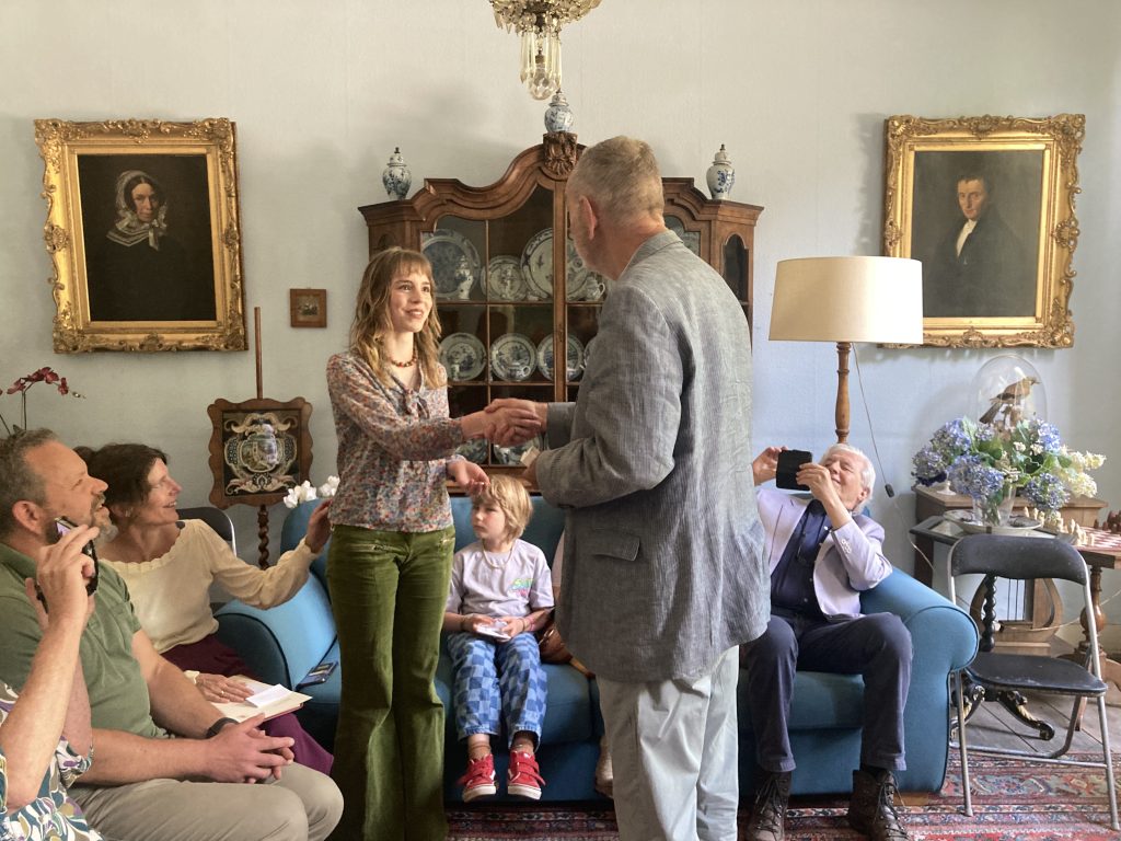 De overhandiging van de penning aan Lena van Beest door de penningmeester van de Teeken Akademie, Gerard Heerebout – foto: L. LabeurDe overhandiging van de prijs aan Lena van Beest door jhr. Alarik van Doorn namens de Ridderschap – foto: L. Labeur