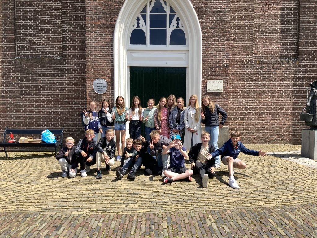 Stadstekenklas van het schooljaar 2023/2024, groep 8 van Basisschool de Oleanderhof uit Arnemuiden voor de kerk op de Markt – foto: L. Labeur