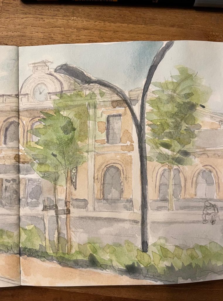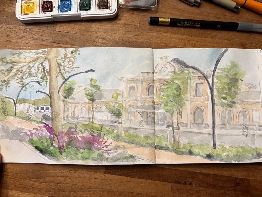 Merel van Rens, Stationsgebouw Middelburg, 2024. Deel van werk in uitvoering, met potlood en waterverf.