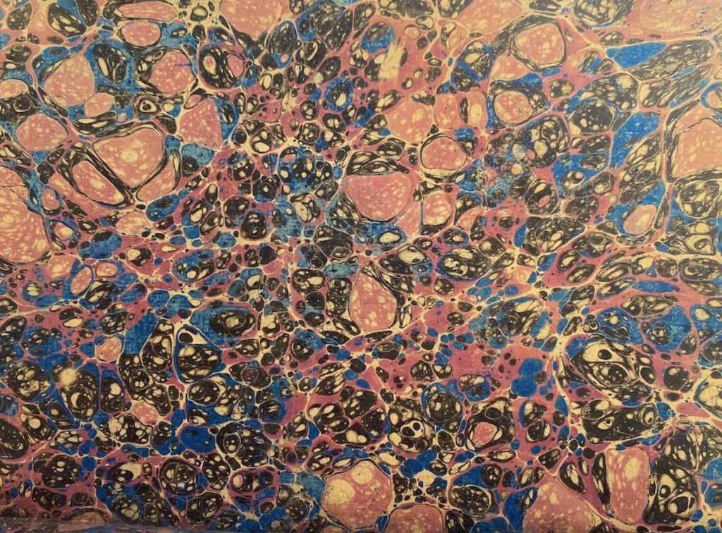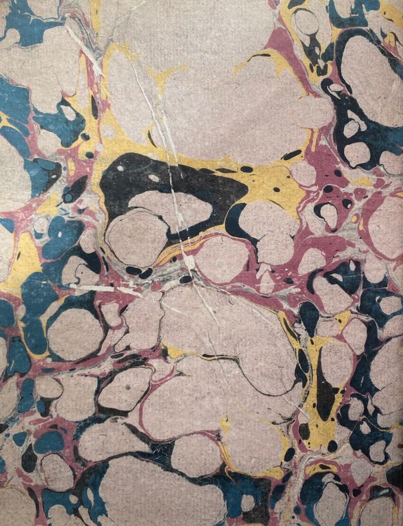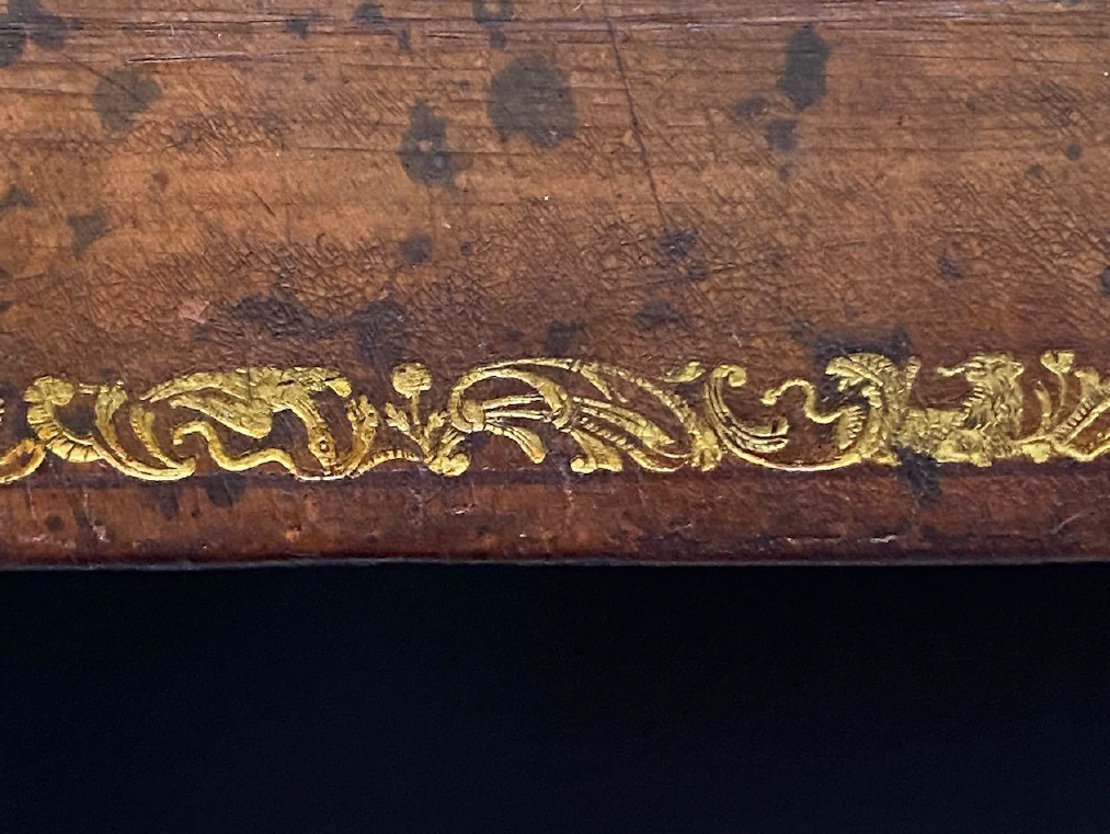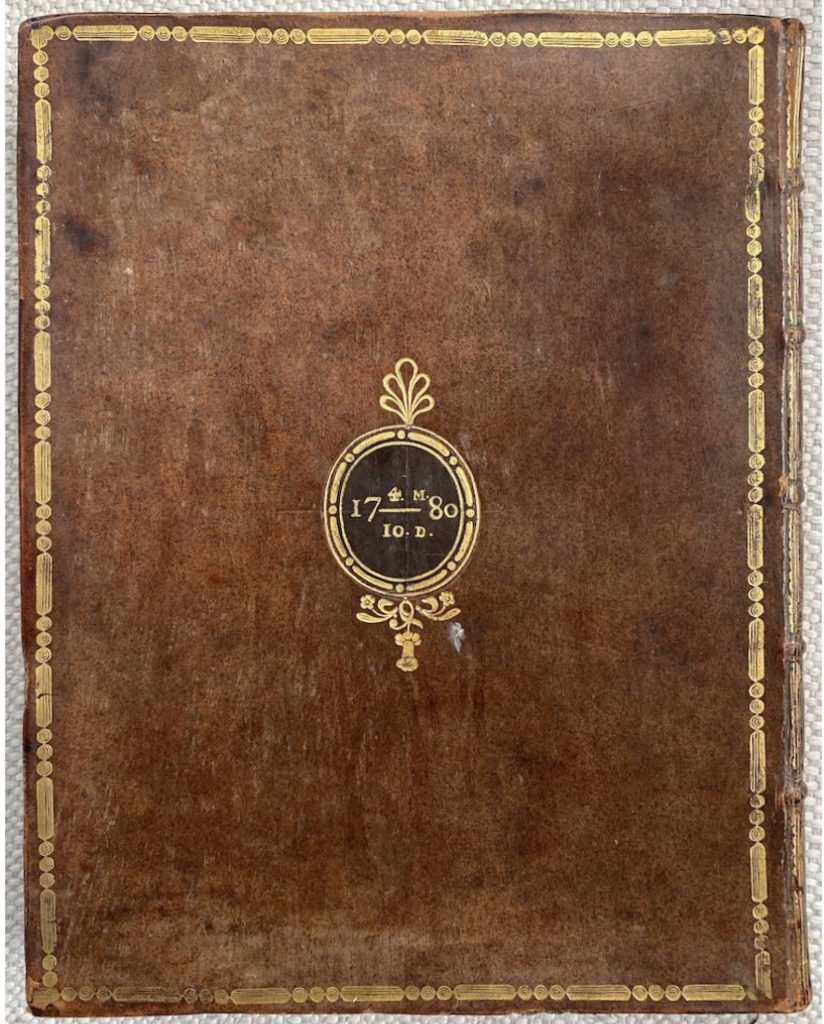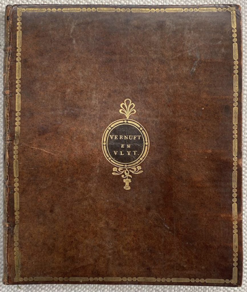Een gave, kalfsleren band die de typische bestempeling met het medaillon ‘Vernuft en vlijt’ op het voorplat heeft en de datum van uitreiking op het achterplat. Ook de overige stempels zijn oude bekenden: ze komen overduidelijk uit het Middelburgse atelier van de binder Jan Dane die in 1783 overleed. Op de staart van de rug staat zelfs een klein stukje van de in mijn ogen meest kenmerkende rol van deze binder. Een forse rol die een doorsnee van ruim 5 cm gehad moet hebben, want eenmaal geheel uitgerold ontstaat een lijnversiering over een lengte van zo’n 20 cm. Daarin springen, lopen en liggen tussen allerlei rococomotieven minstens 5 verschillende dieren. In deze boekband ontbreekt het rode lakzegel aan de binnenkant van het voorplat, zoals dat wel in andere bekende banden voorkomt. Bij nadere beschouwing blijkt dat er wel geweest te zijn. Het gat is gecamoufleerd met een marmeren schutblad dat duidelijk afwijkt van het schutblad achterin. Dat is onmiskenbaar een stuk uit een groter vel marmerpapier waaruit Jan Dane vaker schutbladen heeft gesneden.