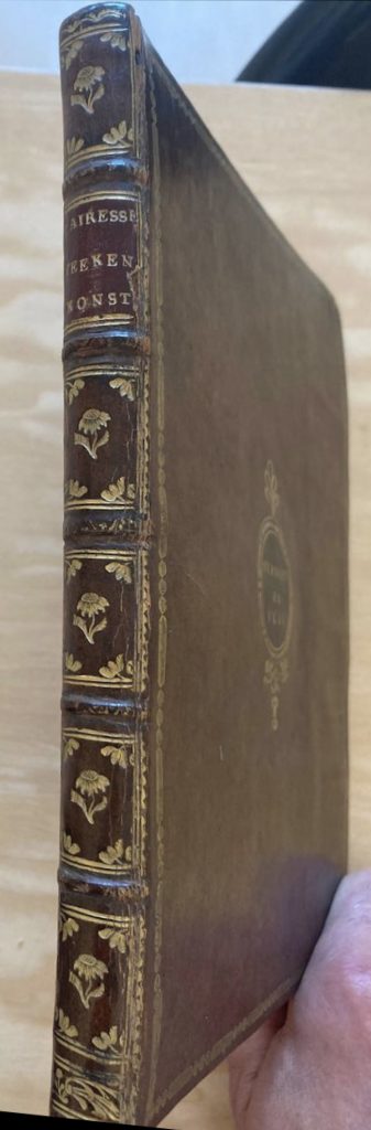 Dankzij deze band is weer een stapje gezet in de kennis over de prijsbanden van de Teeken Akademie. Niet eerder zag ik een kalfsleren band van de Teeken Akademie uit de 18e eeuw, wel meerdere marokijnen, altijd prijzen voor de besten in tekenen. We weten nu dat er in de relatief vette jaren voor de Franse tijd waarin kostbare boekbanden werden geschonken, de mindere prijzen weliswaar fraai waren, maar soberder en van minder kostbaar leer, wat de het uitvoeringsniveau van alle banden na 1813 werd.