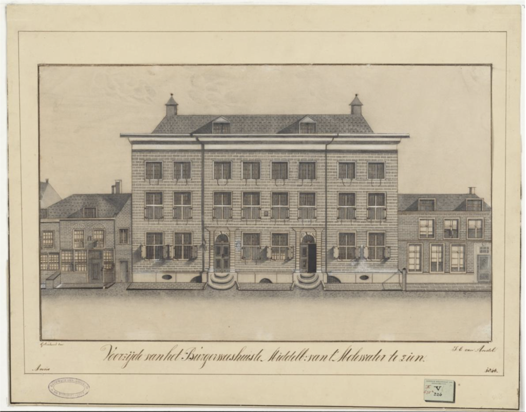 J.E. van Andel, Voorzijde van het Burgerweeshuis te Middelburg van ’t Molenwater te zien, 1846. Gewassen tekening in o.i. inkt, 32 x 52 cm – Zeeuws Archief, Collectie KZGW ZI-II-0675a