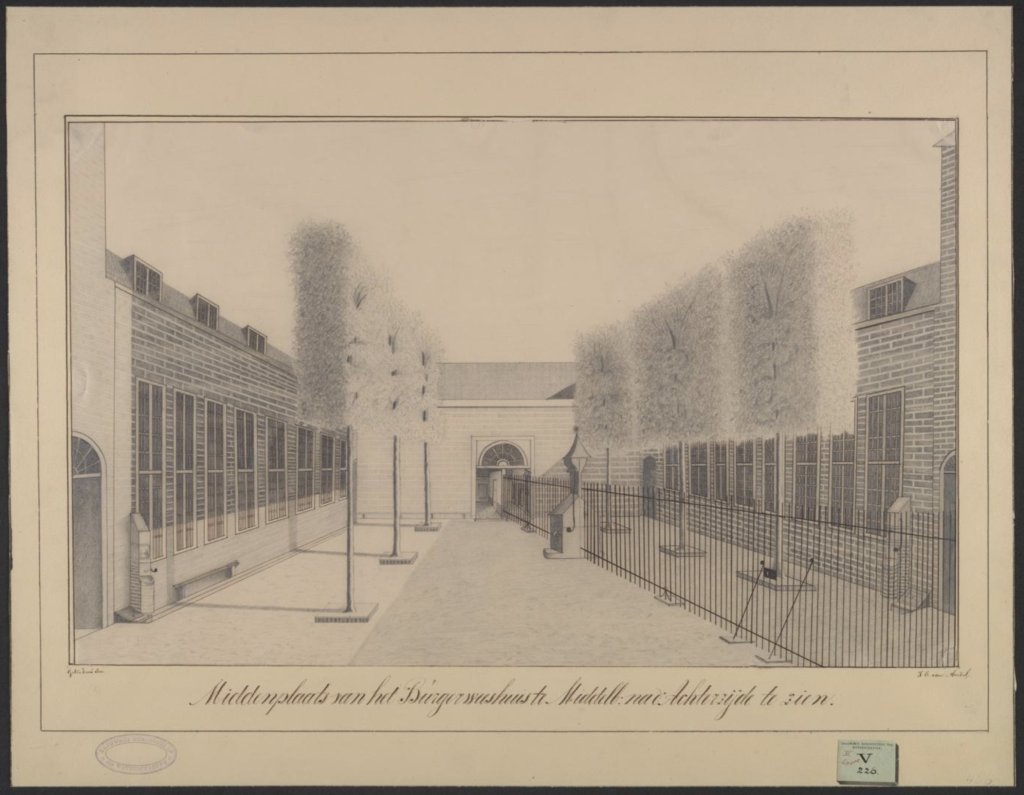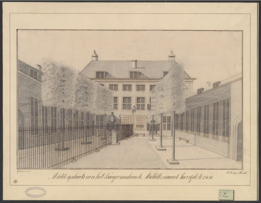 J.E. van Andel, Middenplaats van het Burgerweeshuis te Middelb[urg]: naar de voorzijde te zien, 1846. Gewassen tekening in o.i. inkt, 32 x 52 cm – Zeeuws Archief, Collectie KZGW ZI-II-0675cJ.E. van Andel, Middenplaats van het Burgerweeshuis te Middelb[urg]: naar achterzijde te zien, 1846. Gewassen tekening in o.i. inkt, 32 x 52 cm – Zeeuws Archief, Collectie KZGW ZI-II-0675d