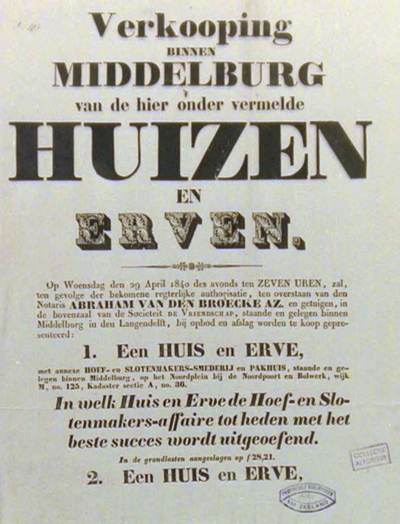 Affiche van de verkoping van ‘Een Huis en Erve, met annexe Hoef- en Slotenmakers-Smederij en Pakhuis’, wijk M nr. 125 bij de Noordpoort (Noordpoortplein), 1840 (Detail) – ZB Bibliotheek van Zeeland. Afbeelding in: Beeldbank Zeeland record. Nr. 8591.