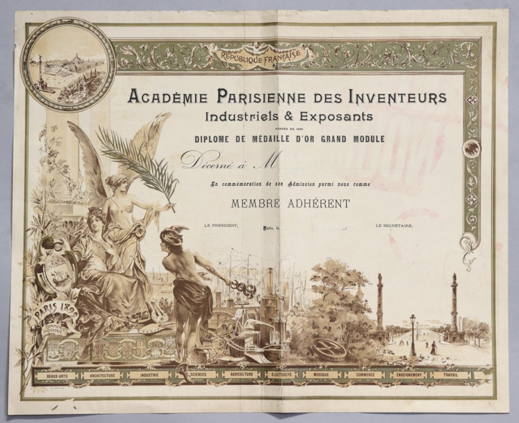 Diploma van de Académie Parisienne des Inventeurs Industriels & Exposants. Ondanks het jaartal 1899 zal de wereldtentoonstelling in Parijs van 1889 bedoeld zijn. De inzet linksboven verbeeldt het tentoonstellingsterrein met de Eifeltoren. De Académie was in Nederland actief tussen 1890-1894. Johannes Bouman werd in 1892 ‘tot lid benoemd’ – Foto veilinghuis Rouillac. Veiling 29-03-2022, lot 60.
