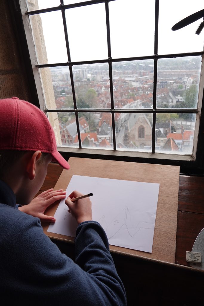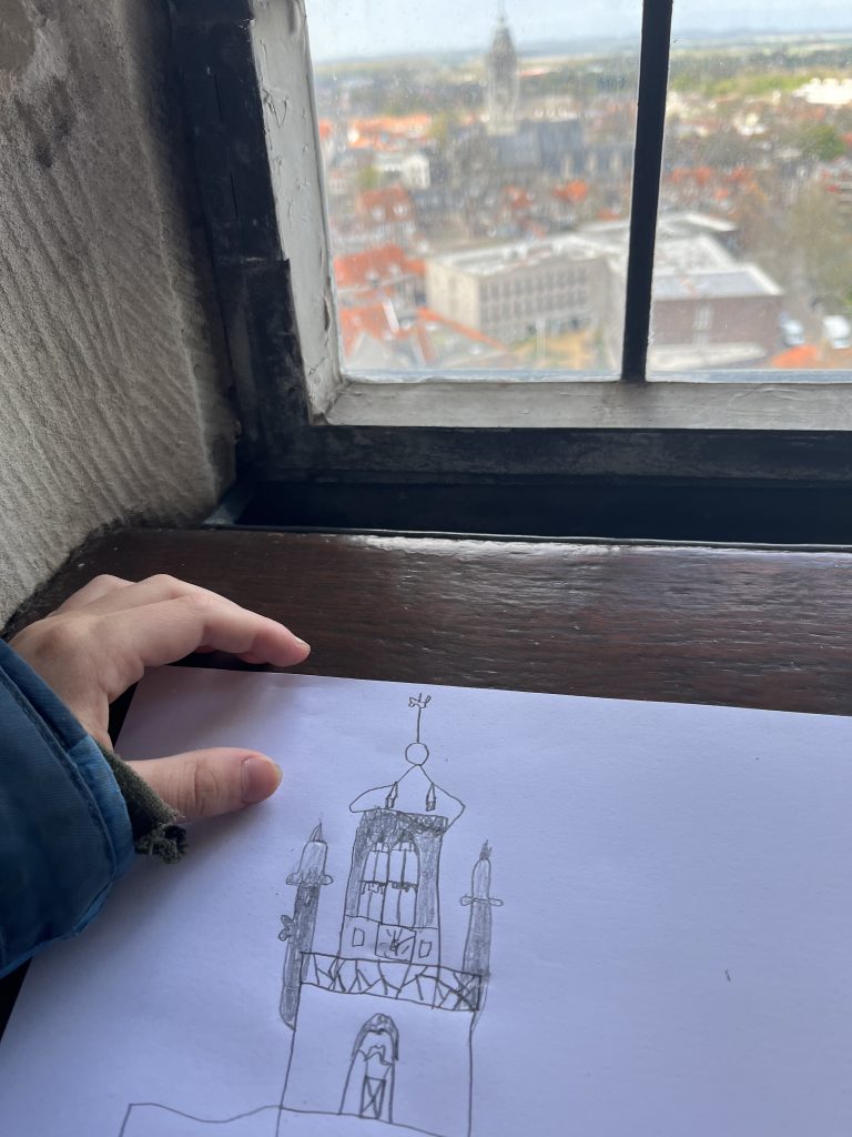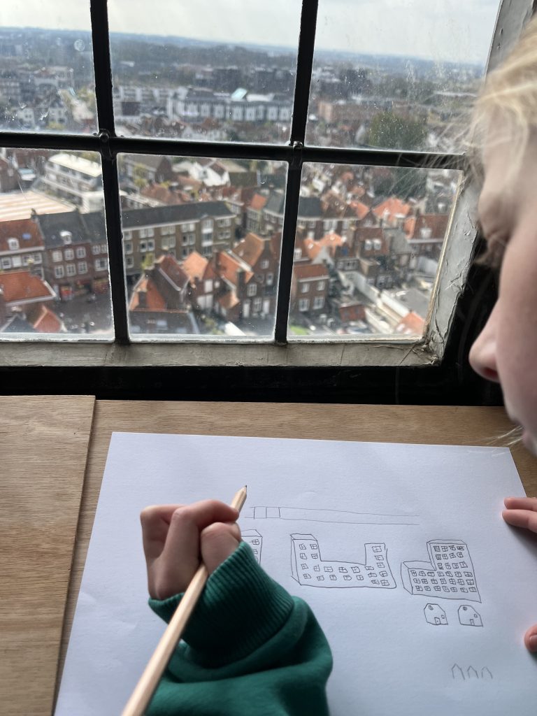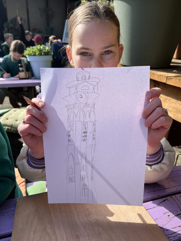 Eerst heeft de Stadstekenklas de toren van buiten bestudeerd. Daarna beklom de klas de Lange Jan en is de groep vanaf boven gaan tekenen. Hieronder een beeldverslag.