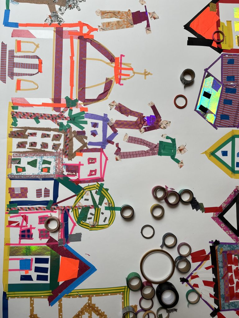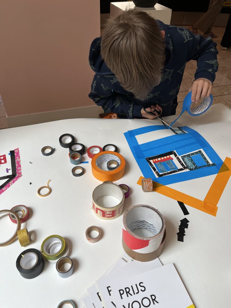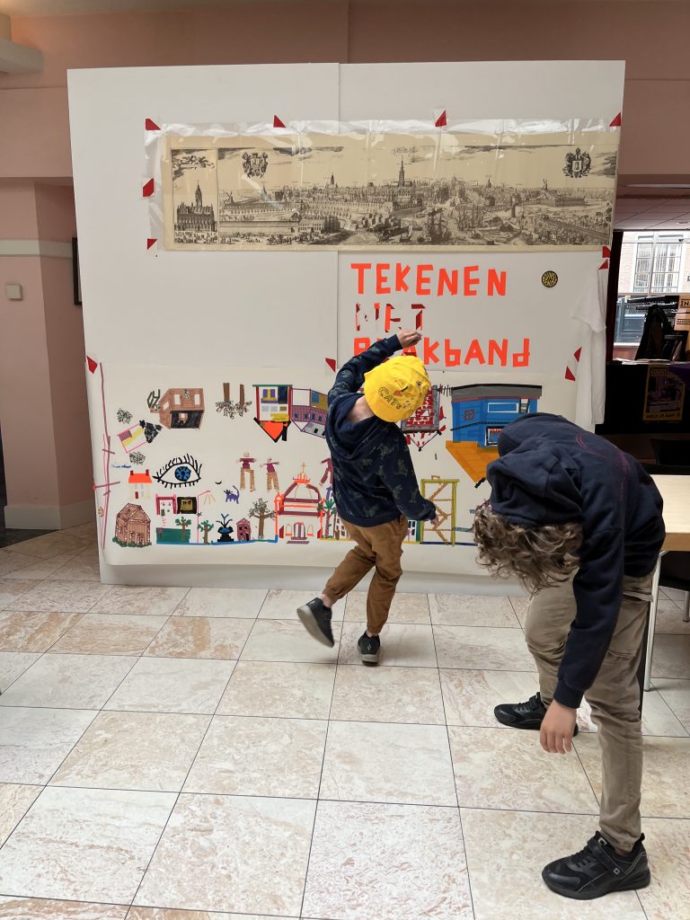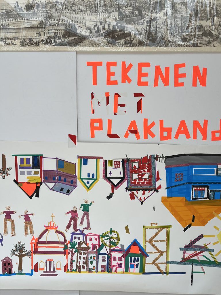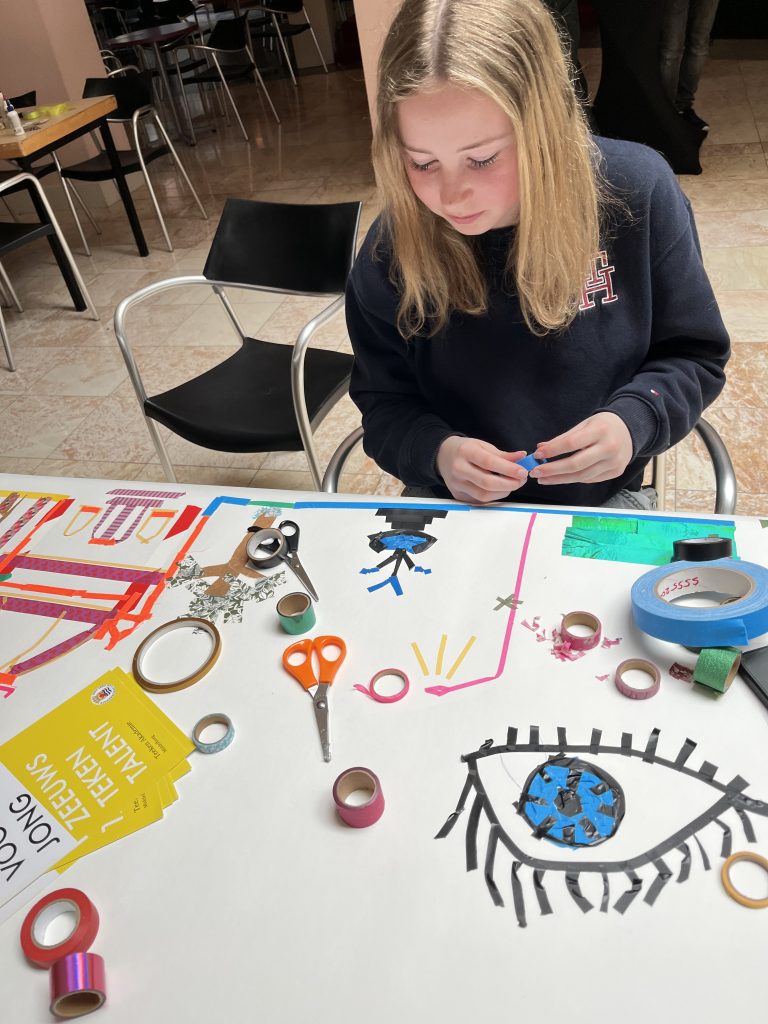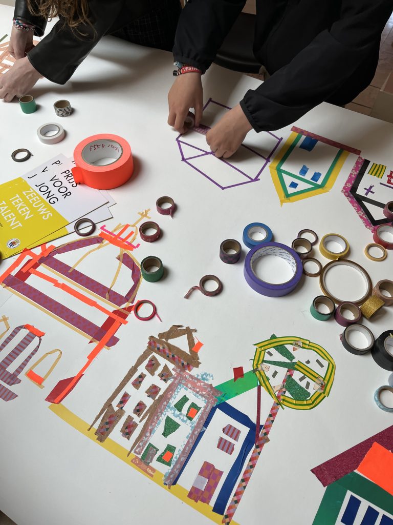 Op 13 april 2025 was de Teeken Akademie bij de Kunstbende in Goes voor een workshop teken je stad, tekenen met plakband – foto’s Liesbeth Labeur