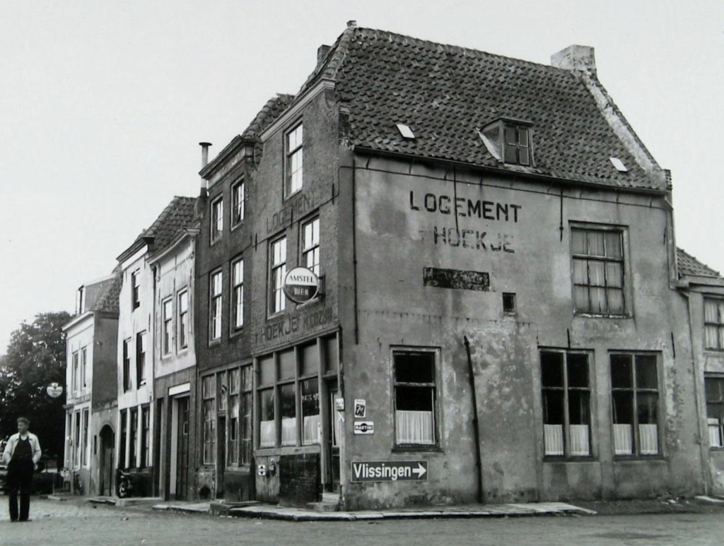 Straatzijde van het Vlissings Wagenplein met Logement ’t Hoekje op de hoek met de Winterstraat (rechts, richting Vlissingen). Foto W.D. de Bruijne, 14-08-1959 – Beeldbank Zeeland, recordnr. 2409
