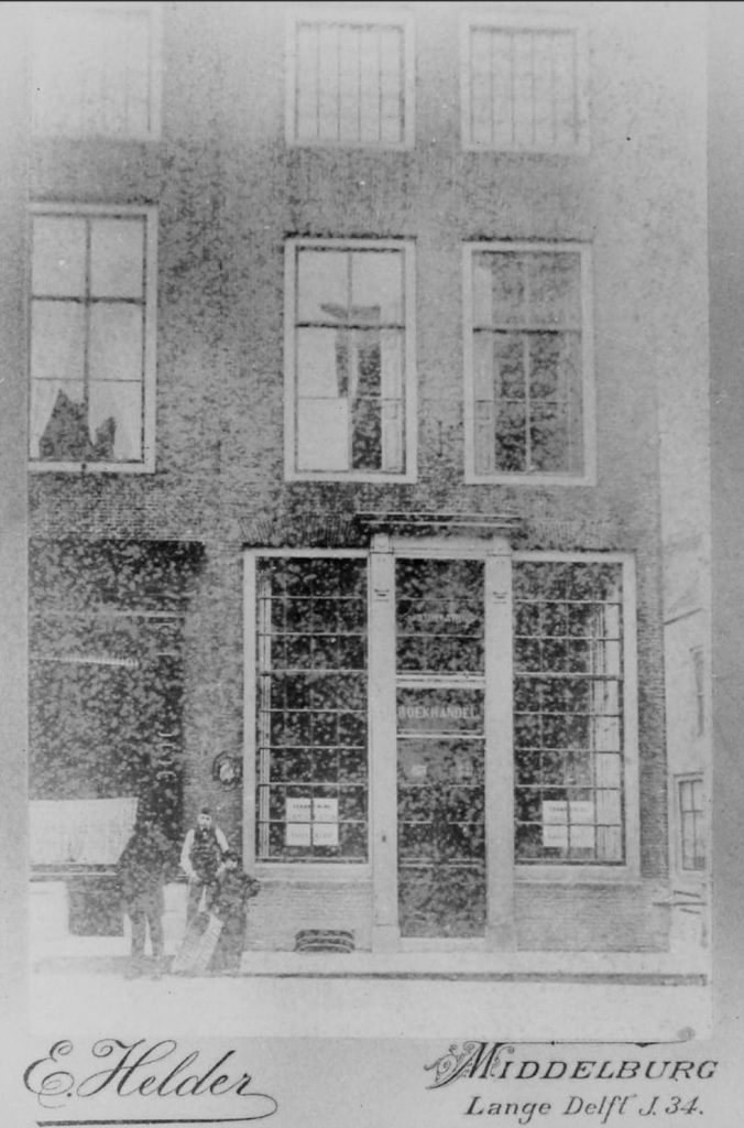 Foto: E. Helder ca.1900. Hoek Korte Delft – Nieuwstraat in Middelburg waar in 1801 Salomon van Benthem zijn boekhandel begon. Rond 1826 trad ‘stiefneef’ Christiaan Jutting bij hem in dienst. In 1837 werd Jutting (sinds 1829 Van Benthem Jutting) medefirmant en heette de boekhandel Van Benthem & Jutting – Beeldbank Zeeland, recordnummer 74272