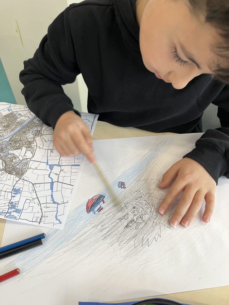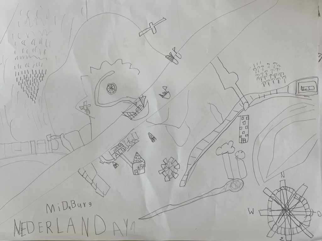 We hebben ook nog een stukje geschiedenis besproken. Over het bolwerk, dat vroeger rond Middelburg liep, en dat er nu nog steeds een stukje bolwerk in Dauwendaele ligt. We bekeken een oude kaart van Middelburg, gemaakt door Cornelis Goliath. Het kanaal was er toen nog niet. Soms was het een beetje abstract om over de kaarten te praten, maar er zijn desondanks prachtige plattegronden van Middelburg gemaakt. Heerlijk om te zien wat er allemaal getekend wordt door onze Stadstekenklas. Met plezier was de Teeken Akademie op bezoek en tot de volgende keer.