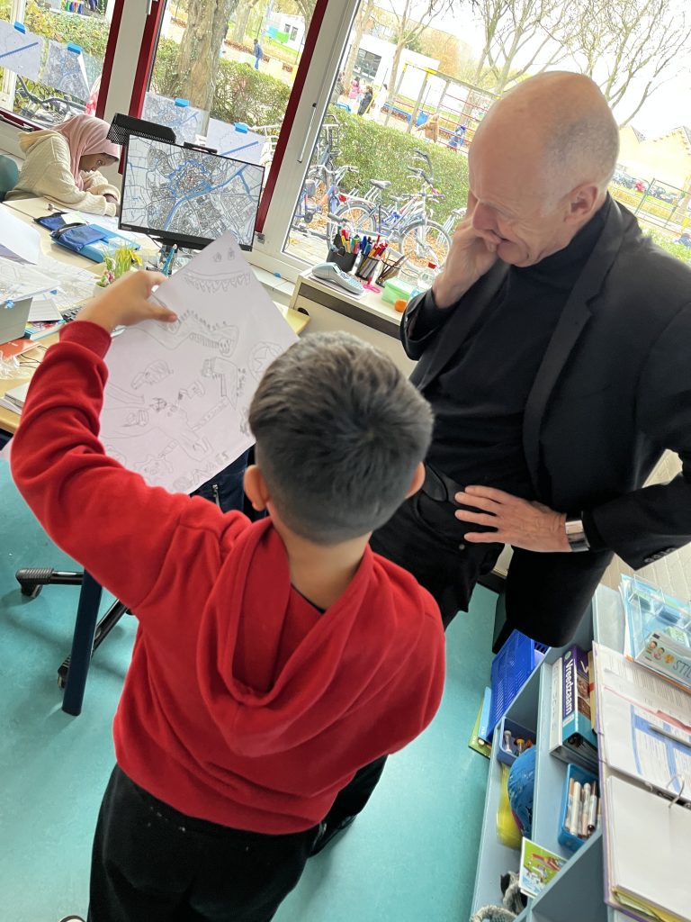 De Stadstekenklas, groep 5 van Basisschool het Element uit Dauwendaele, de klas van meester Yordi Wieland, had vandaag de voorzitter van de Teeken Akademie op bezoek, Arnold Wiggers. En kunstenaar Liesbeth Labeur. Met de klas hebben we het vandaag gehad over topografie. Op de kaart van Middelburg hebben we opgezocht waar de school ligt. En waar het stadhuis ligt, dat we de vorige keer tekenden. En Dauwendaele.