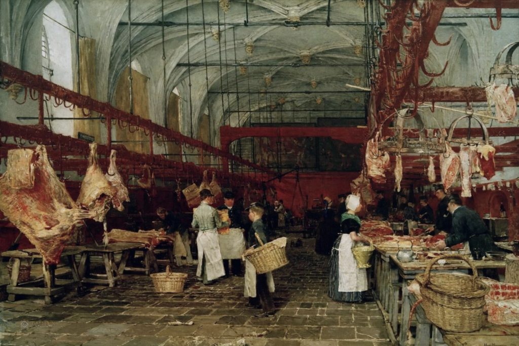 Hans Hermann (J.E.R. Herrmann)(1858-1942), De Middelburgse vleeshal, 1887. Olieverf op doek. Vers vlees werd in de vleeshal verkocht, het slachten gebeurde elders. Het naambordje links vermeldt R[obertus] Meertens. Vader en zoon (beiden Robertus) waren vleeshouwers. Vader ging in 1889 failliet.