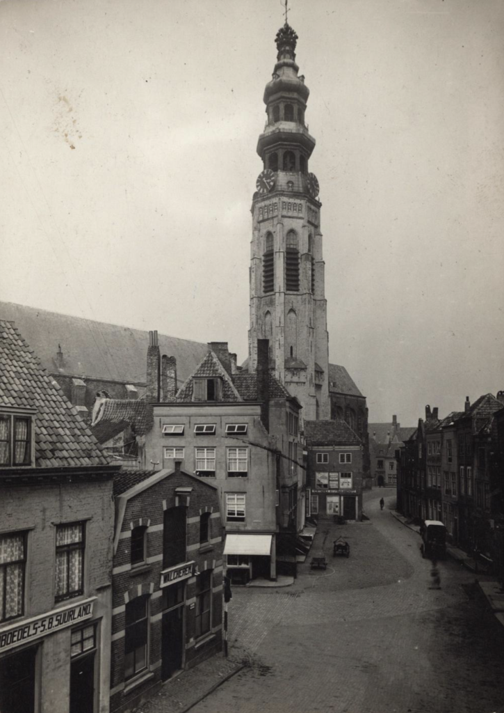 Kijkje door de Wal op de Lange Jan. De straat links is de Kapoenstraat. Het pand links vooraan (Inboedels S.B. Suurmond) zou B 99 geweest kunnen zijn, waar Pieter Sloover en later zijn zoon Karel hun schilderszaak hadden. Fotograaf onbekend, ca. 1920 – Zeeuws Archief, Verzameling Beeld en Geluid, nr. 400
