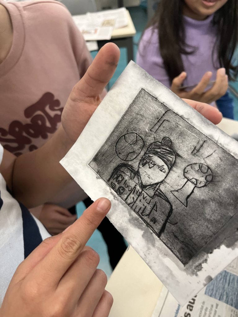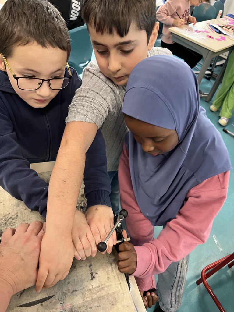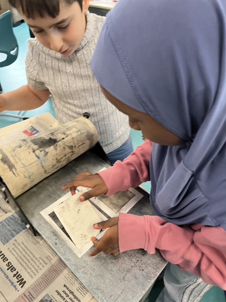 De Teeken Akademie was op 10 december jl. op bezoek bij de Stadstekenklas, groep 5 van Het Element uit Dauwendale, de klas van meester Yordi Wieland. Kunstenaar Liesbeth Labeur liet de klas dit keer een hele oude manier van printen zien: de etstechniek. De leerlingen hebben het etsen ook zelf uitgeprobeerd. Tekenen met een punt en daarna ininkten en een afdruk maken met de etspers.