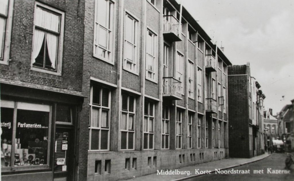 Korte Noordstraat (richting Lange Noordstraat) met de kazerne rond 1950. Ongeveer bij het eerste balkon was wijk I nr. 17 waar Pieter Hendrik Seijbel en zijn gezin woonde. Foto D.P. Cornelisse – ZB, Beeldbank Zeeland recordnr. 13326